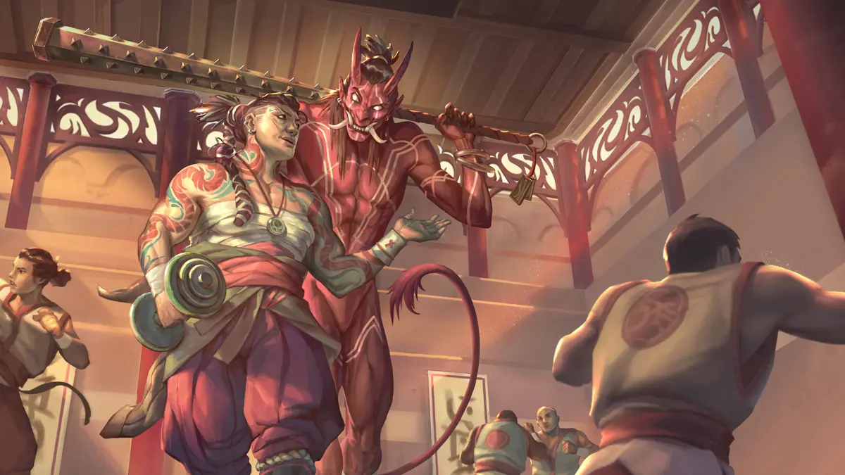 L'oni arme son tetsubō et frappe de toutes ses forces, brisant les poutrelles de bois de la coursive comme de malingres brindilles. La barre de métal fond avec rage et fureur sur le Mage, qui invoque calmement un bouclier prismatique. L'impact fait exploser la rambarde, dans un déluge de fragments de bois.