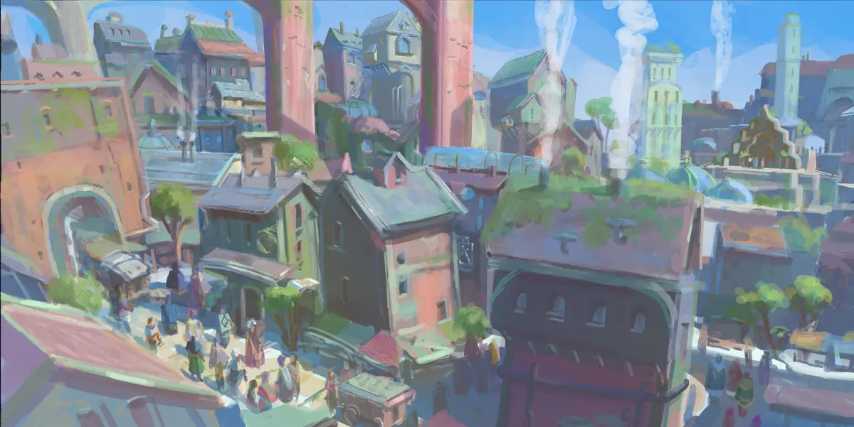 Érigée sous les contreforts flottants de Caer Esvander, la Cité de Dusk est une ville en altitude, perpétuellement noyée dans les brumes de l’Inframer. Habitats troglodytes y côtoient pontons et bâtiments en aérolithe. Y vivre, c’est s’habituer au grincement permanent des cordages, au langoureux tangage des rochers qui forment un plafond occultant le ciel, et surtout supporter le vertige d’une existence en hauteur, sans presque jamais voir le plancher maritime en contrebas. Dusk est avant tout un petit port de pêche, mais c’est aussi devenu un lieu de maintenance des brise-brumes quand ils passent par la Route Sundström qui relie Utval à la capitale. C’est aussi là que l’Ouroboros pose ses amarres une fois chaque année pour se ravitailler et effectuer des réparations.